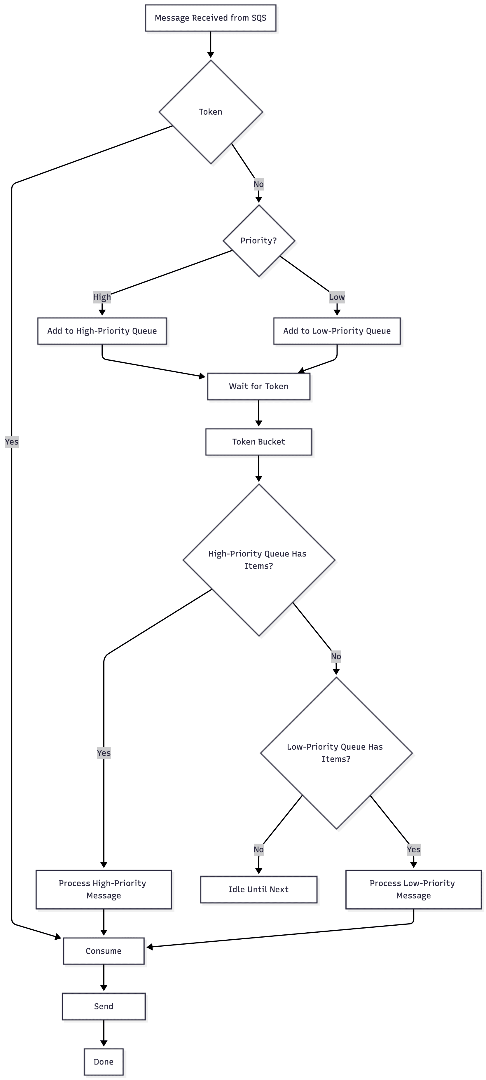 refillTokens()),processWaiters()is triggered and resolves waiters in priority order. - This ensures we never send more than our allowed rate, while still using the queue for burst smoothing.